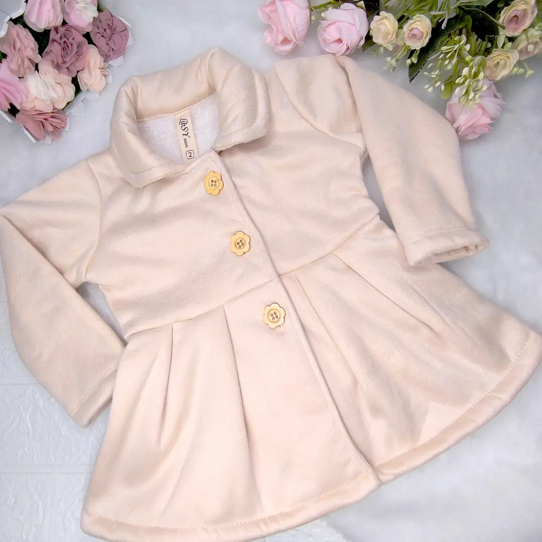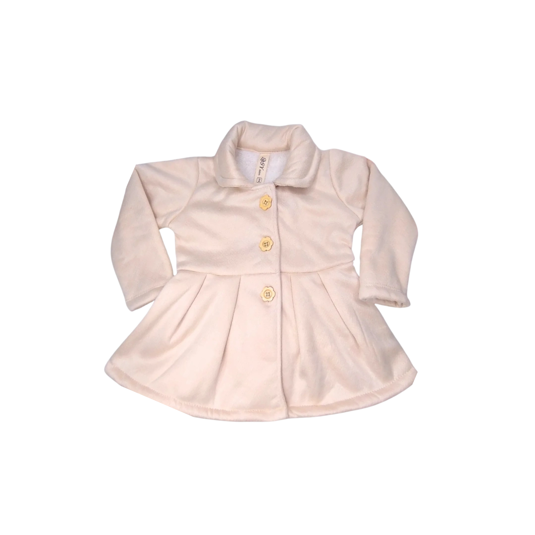 Este abrigo en color champán es la prenda ideal para darle a tu niña un toque de elegancia y calidez en los días fríos. Confeccionado en tela térmica y suave, su diseño presenta un cuello redondo clásico, botones de madera y un corte con vuelo que realza su estilo sofisticado. Su ajuste cómodo permite libertad de movimiento, siendo perfecto tanto para eventos especiales como para el uso diario. Disponible en tallas 2, 4, 6, 8, 10, 12 y 14.