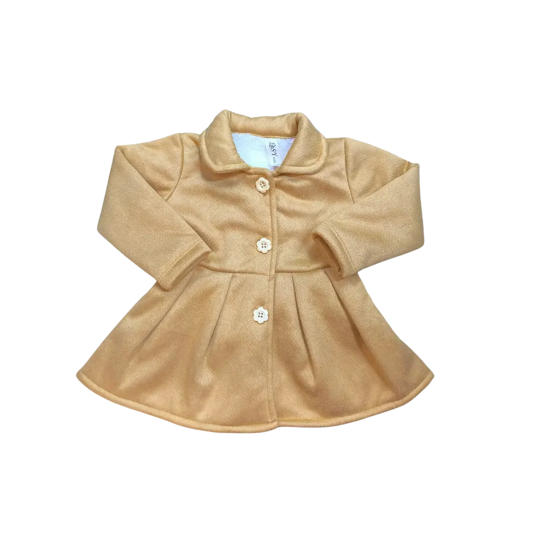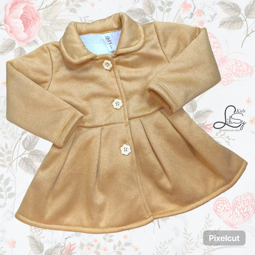 Este hermoso abrigo mostaza es la opción ideal para combinar elegancia y calidez en los días fríos. Confeccionado en tela térmica y suave, su diseño cuenta con cuello redondo clásico, botones de madera y un corte con vuelo que resalta su estilo sofisticado. Su ajuste cómodo permite libertad de movimiento, siendo perfecto tanto para ocasiones especiales como para el uso diario. Disponible en tallas 2, 4, 6, 8, 10, 12 y 14.